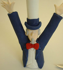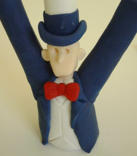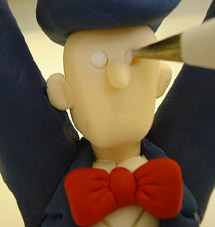using a small brush and the red food color, paint the strips carefully onto the hat and the waistcoat.