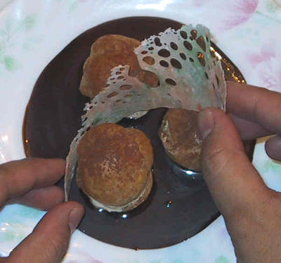 Peel off the silpat mat. Reheat the bubble sugar using a heat lamp or