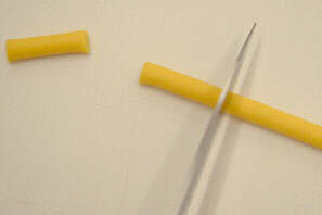 Roll out a thin sausage of yellow paste and cut two equal lengths from it.