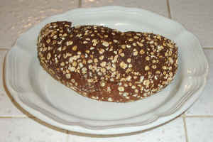 Place water in the pan and then place the rest of ingredients in the pan as listed in order. Make a well in the dry ingredients and place dry yeast in. **Note** If you want to have oatmeal flakes on the outside, during the last cycle of kneading the dough and before it raises, remove dough and spray with water. Roll dough in oats. Place dough back in machine and let it continue rising and baking.