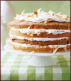 Japanese Fruit CakeThis recipe, adapted from Dolphin Dishes: The Submarine Cook Book, published in 1952 by the New London Navy Relief Society of New London, Connecticut, has a somewhat puzzling title. Perhaps this cake was considered Japanese because it contained coconut, an exotic ingredient at the time. Yield: one 9-inch cake Cake: Coconut Frosting: Preheat the oven to 350 F. Butter and flour two 9-inch round cake pans. Sift the cake flour with the baking powder, baking soda and salt. In a large bowl, using an electric mixer, beat the butter with the granulated sugar at high speed until light and fluffy, about 5 minutes. Beat in the eggs, 1 at a time, beating well after each addition. Stir the vanilla into the buttermilk. Using a large rubber spatula, stir the dry ingredients into the batter in 2 batches, alternating with the buttermilk. Scrape half of the batter into 1 of the prepared cake pans and smooth the surface. Fold the walnuts, currants, cinnamon, allspice and cloves into the remaining half of the cake batter. Scrape the spice batter into the second cake pan and smooth the surface. Bake the cakes in the middle of the oven for about 25 to 35 minutes, or until a toothpick inserted in the center of each comes out clean. Transfer the cakes in their pans to wire racks and let cool for 15 minutes, then turn them out onto the racks and let cool completely. Leave the oven on. Meanwhile, make the coconut frosting: In a medium saucepan, bring 1 inch of water to a simmer over moderate heat. In a medium stainless steel bowl, combine the egg whites with the confectioners' sugar, water and cream of tartar. Using clean beaters, beat at medium speed until blended. Set the bowl over the simmering water and beat at high speed until thick and fluffy, about 7 minutes. Remove the bowl from the pan and beat the vanilla and lemon zest into the frosting. Using a serrated knife, halve each cake layer horizontally. Set 1 plain cake layer on a cake plate and spread with 1 cup of the frosting. Sprinkle 1/2 cup of the toasted coconut over the frosting, then spoon 1/2 cup of the frosting around the edge and in the center of the cake. Top with a spice cake layer. Continue frosting and sprinkling with this and the remaining cake layers, alternating the plain and spice cakes. Spread the top of the cake with the remaining frosting and sprinkle with the remaining coconut. Cut into wedges and serve. Make ahead .... the 2 uncut cake layers can be wrapped in plastic and stored overnight at room temperature. The frosted cake can be stored at room temperature for up to 4 hours. Note: Source: Food & Wine - send a Food & Wine gift subscription