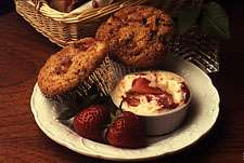 peaks. Serve muffincakes topped with cream and strawberries. Arrange in serving bowl;